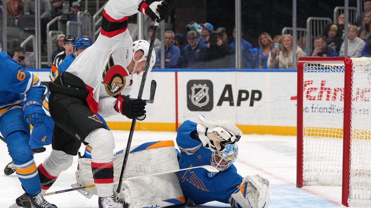 Ottawa Senators' Brady Tkachuk, left, is unable to score past St. Louis Blues goaltender Jordan Binnington during the third period of an NHL hockey game Friday, Nov. 28, 2025, in St. Louis. Credit: AP/Jeff Roberson