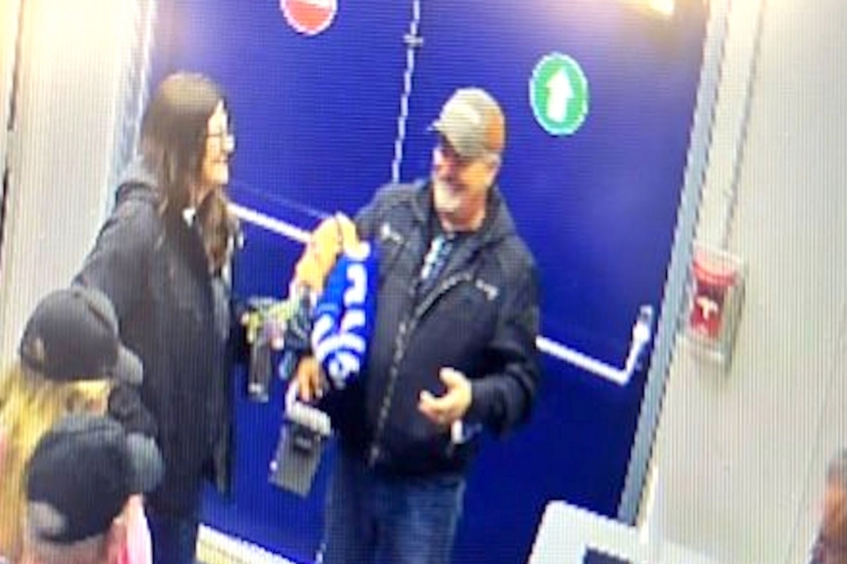 He may have been accompanied by a woman described as approximately 50 years old, Caucasian, with long brown hair, glasses, and wearing a black jacket and blue jeans.