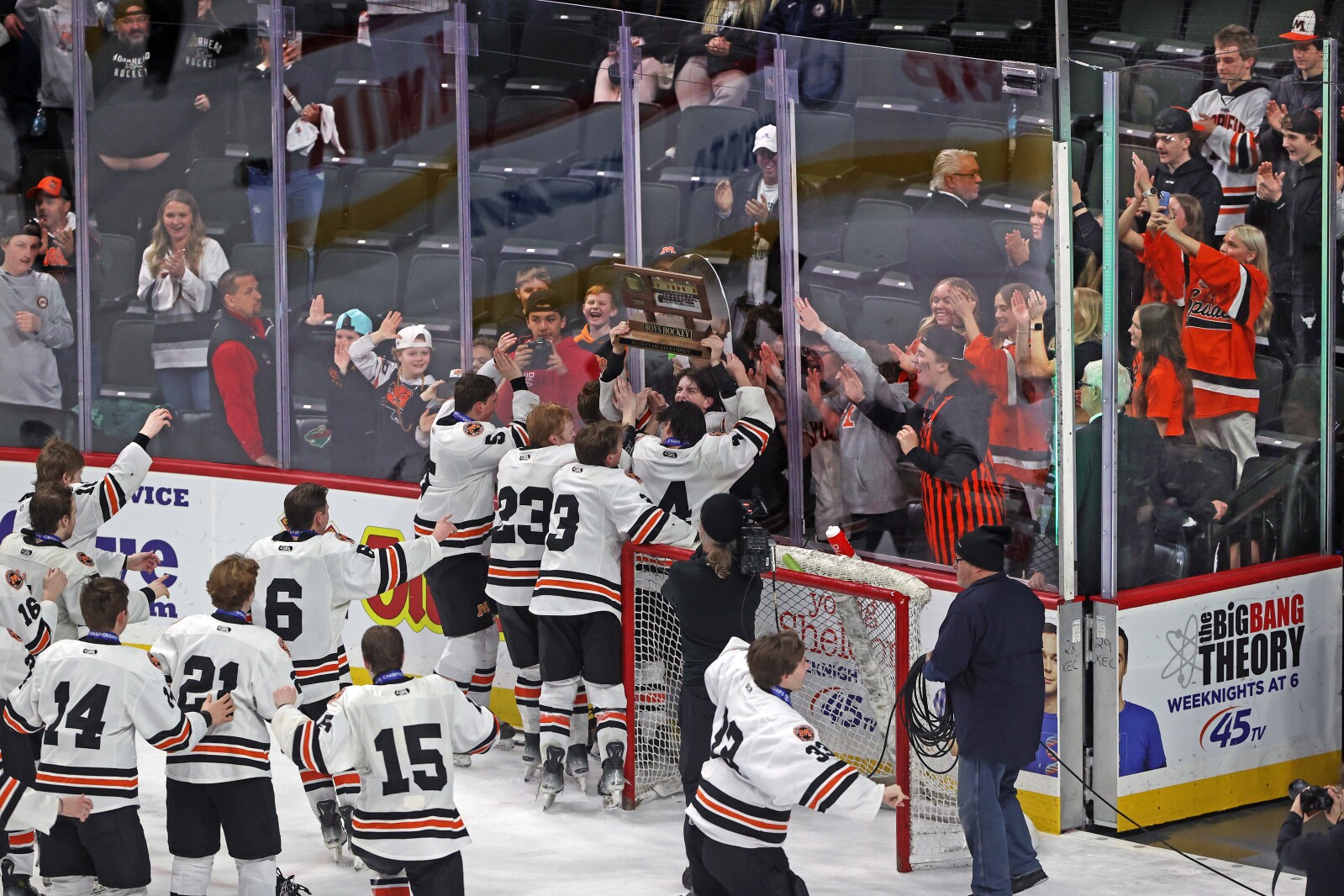 Spuds forward Mason Kraft had a legendary first period, scoring four goals in the opening 17 minutes. Kraft’s effort helped spark the Spuds to a Class 2A championship, the first state title in program history after eight previous title game losses.
